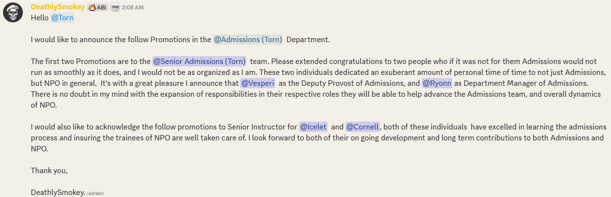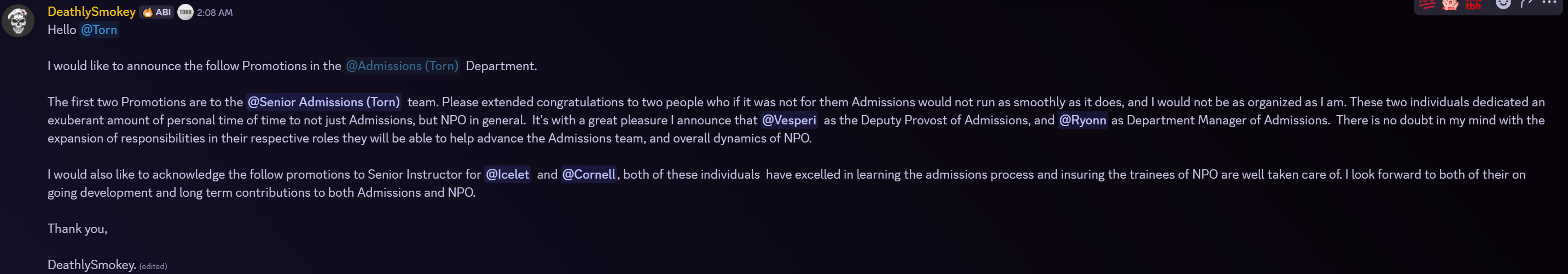 | Description | DeathlySmokey announces promotions in the Admissions Department. |