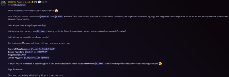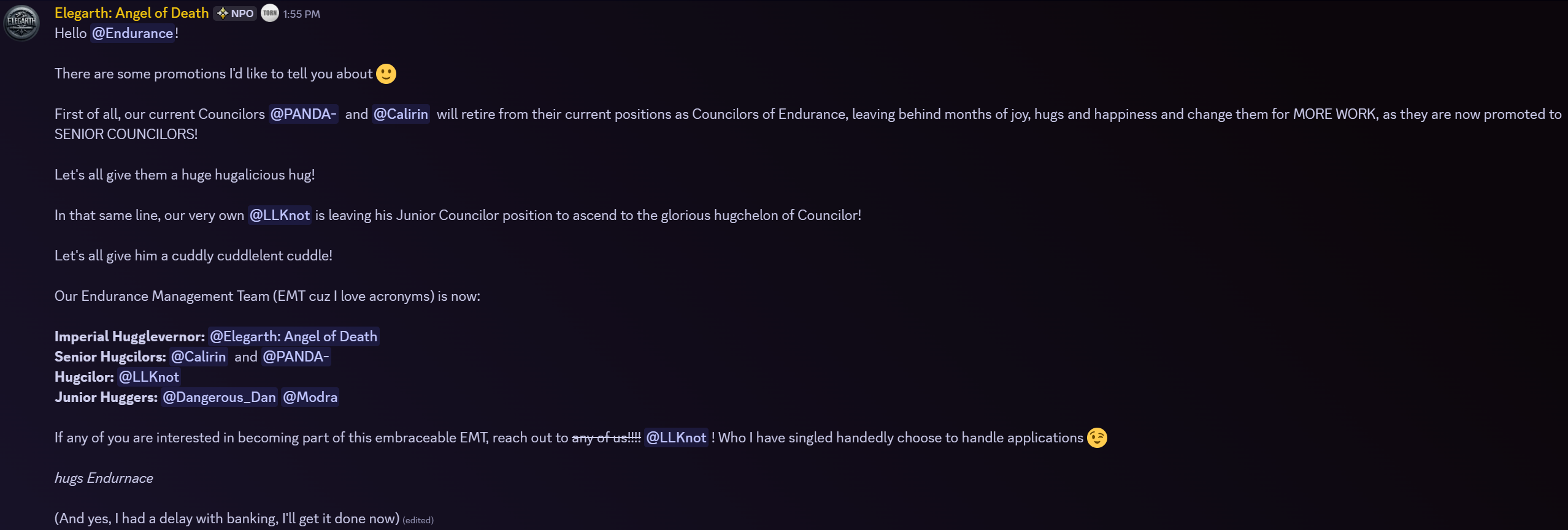 | Description | Elegarth announces changes to Council in NPO - Endurance. |