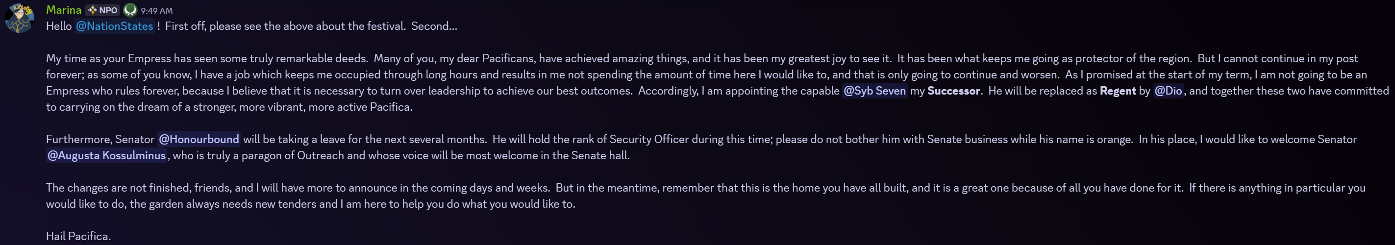 | Description | Marina announces the next successor to Emperor and Delegate of The Pacific. |