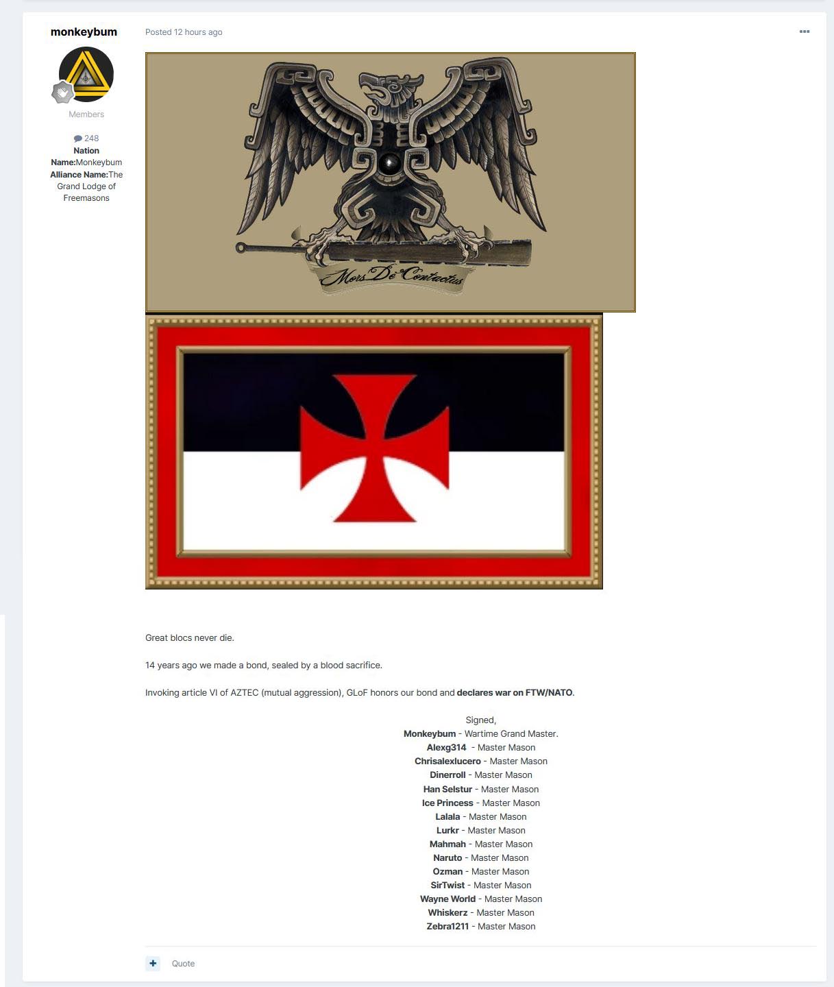 On November 9, 2020 DBDC posted an announcement in which they "declared war on all nations, except for those we don't".[1] Upset that Doom forces raided as they wished, seeing little retaliation due to their ties, NATO and FTW responded with a declaration of war on June 25, 2022 against all Doom alliances.[2]